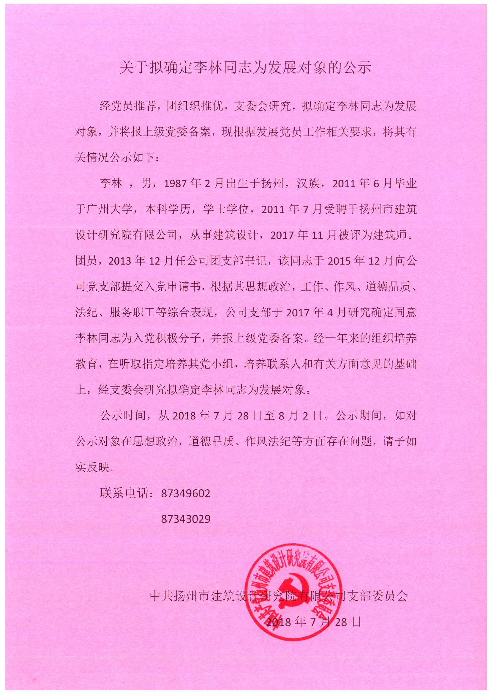 ·關(guān)于擬確定李林同志為發(fā)展對象的公示